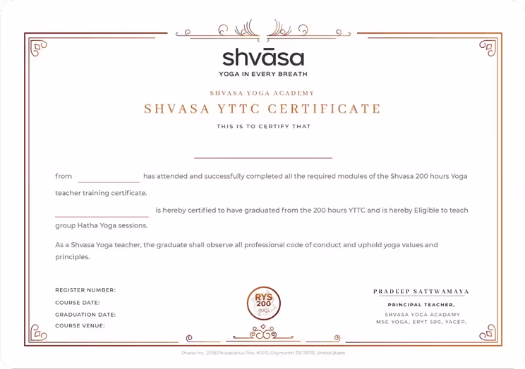 Shvasa's 200-hour Online Yoga Teacher Training (YTT 200) is Yoga Alliance-certified, offering a structured path to deepen your practice and teach others. Gain a solid foundation in yoga philosophy, and learn to guide, adjust, and customize classes. Complete the course and earn your RYT 200 certification to teach worldwide.